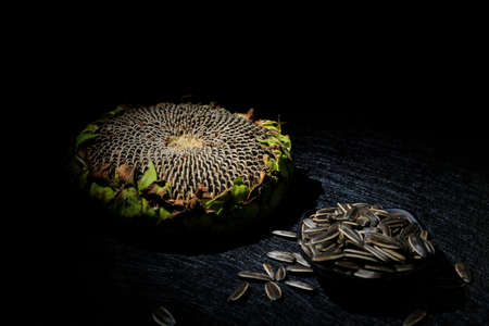 Harvested sunflower head and seeds on wooden rustic table