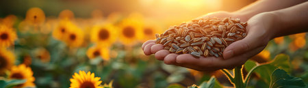 Hands holding sunflower seeds with a field of blooming sunflowers in the background, bright daylight