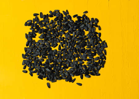 Black sunflower seeds on yellow background. High quality photo