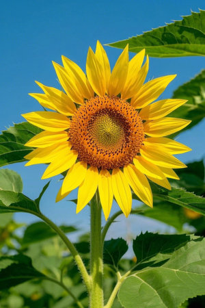 A breathtaking sunflower in full bloom under a clear blue sky, displaying vibrant colors and natural beauty