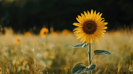 Close-up of a single sunflower in a vast field with a blurred background, leaving plenty of space on the right side for copy or logos.