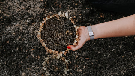 Woman holding ripe sunflower cap. Threshing sunflowers seeds by hand. Rich harvest in Ukraine, working at home. Oil will be.
