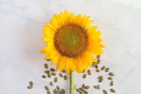 Sunflower and sunflower seeds spread on table