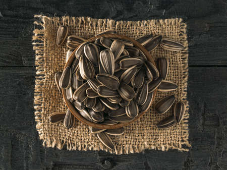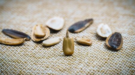 Sunflower seed stands on a sack background.