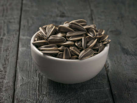 Large sunflower seeds in a ceramic bowl on a wooden table. The fresh yield of sunflower.