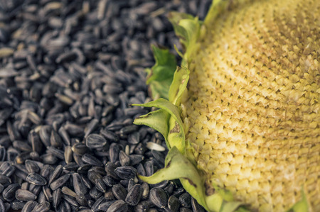 Vegetable background, black sunflower seeds close-up. Sunflower flower with ripe seeds.