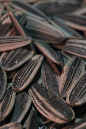 Close-up of black sunflower seeds. texture, background of natural and healthy snacks. Macro photography with shallow depth of field