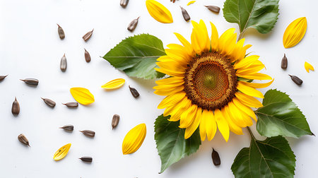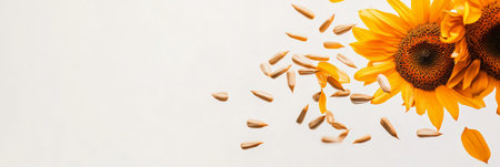 Sunflower seeds and petals falling from vibrant yellow sunflowers against a clean white background, highlighting the beauty and bounty of nature