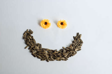 Guazi / Kuaci Baked Plant Seed Kuaci Snack and Sun Flower Creating Smiling Face in White Background