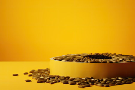 yellow podium close shot golden backg studio with sunflower seeds