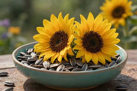 Sunflower seeds in a bowl with sunflowers in the background