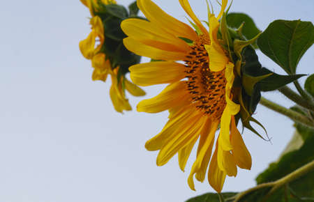 Blooming sunflower on a background blue sky. Copy, empty space for text.