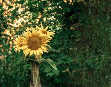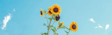 Cute beautiful yellow sunflower heads against blue sky outdoors. Flower heads growing on stems with leaves. Natural eco rustic countryside background. Web banner header.