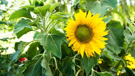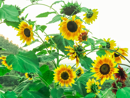 Sunflowers in the garden in a summer day. Sunflower bushes.