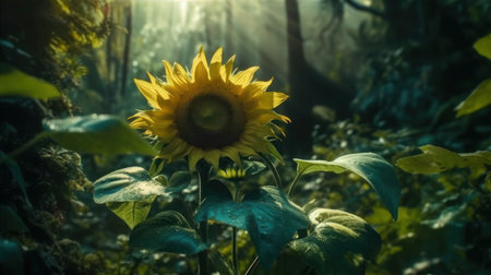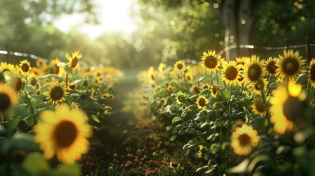 Bright yellow sunflowers growing in the field and sun rays through the eco plant in summer