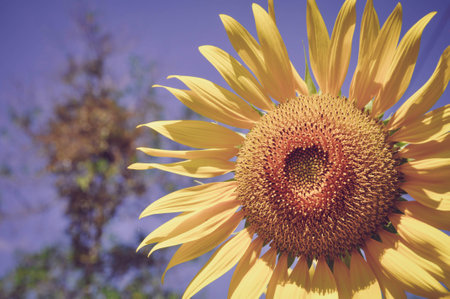 Beautiful young sunflower head with golden petals on the field. Toned, old style classic photo.