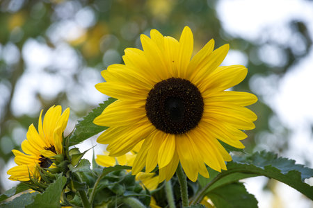 Yellow sunflower, helianthus in the middle of a meadow with a bee on it. Close up view, blur nature background.