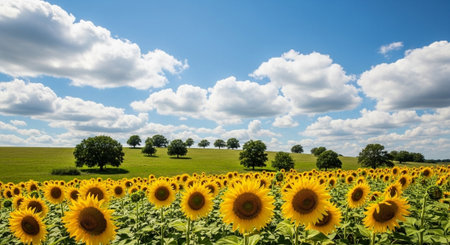 A vast sunflower field in full bloom with a stunning sunset and mountains in the distance, epitomizing serene natural beauty and the calmness of an idyllic rural landscape. AI generated image
