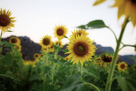 Sunflower field with bright yellow sunflowers close up. Beautiful field of blooming sunflowers against sunset golden light and blurry mountains landscape background. Agricultural field with yellow sunflowers against the sky with clouds
