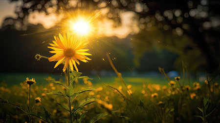 A vibrant sunflower stands tall in a lush green field, illuminated by the soft glow of the late afternoon sun. The surrounding sunflowers create a cheerful backdrop, enhancing the serene atmosphere.