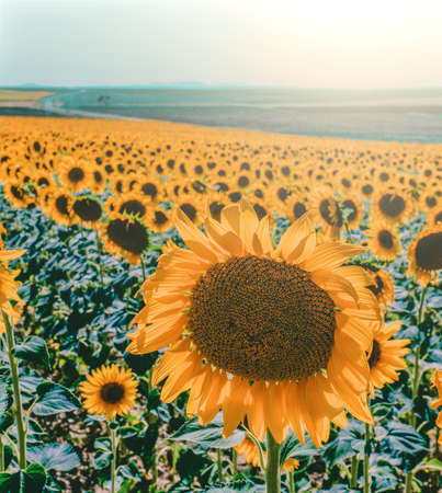 Bright yellow sunflower on big agricultural field with sunset light background, summer nature flower