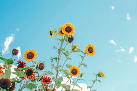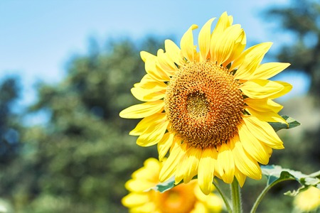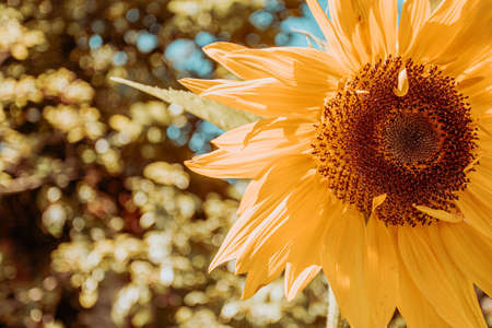 Close up of blooming sunflower on a sunny day against blue sky. Countryside summer landscape with golden sunflowers and copy space