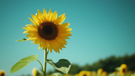 A stunning sunflower stands tall against a clear blue sky, embodying the essence of summer. Its vibrant yellow petals and brown center create a lively scene.