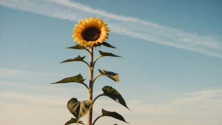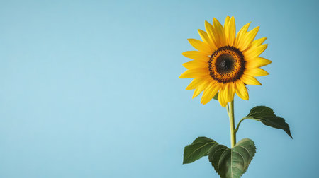 This vibrant sunflower stands tall against a soft blue background, showcasing its cheerful yellow petals and green leaves, perfect for nature-themed projects.