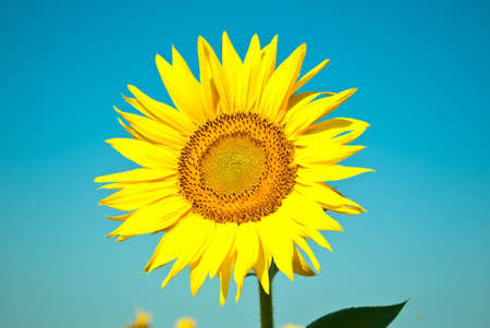 Sunflower in the field with blue sky background. (Helianthus annuus)