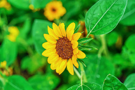 Yellow Decorative Sunflowers on garden background close up shot.