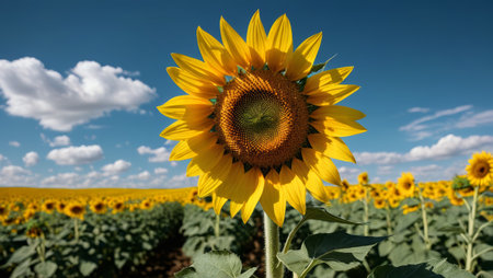 A stunning sunflower stands tall against a bright blue sky adorned with fluffy white clouds, evoking feelings of warmth, beauty, and tranquility in nature.