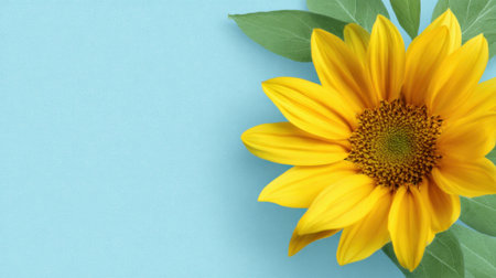 A single bright yellow sunflower with green leaves is placed against a light blue background, showing its vibrant petals and intricate center, creating a cheerful atmosphere.