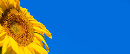 Sunflower and blue sky as background. Harvest concept. Banner