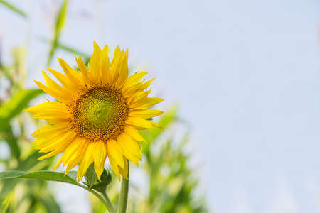 Blooming sunflower on a background blue sky. Copy, empty space for text.
