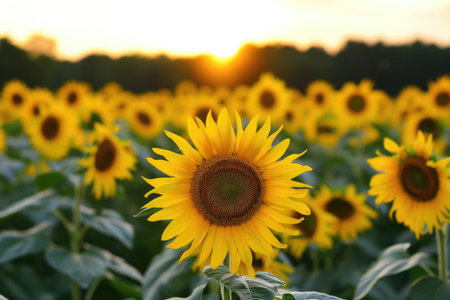 A stunning sunflower field captured during golden hour, showcasing vibrant yellow blooms against a serene sky. Ideal for nature lovers and agricultural themes.