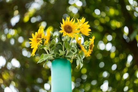 Sunflowers in a glass vase against green trees with bokeh as a background.