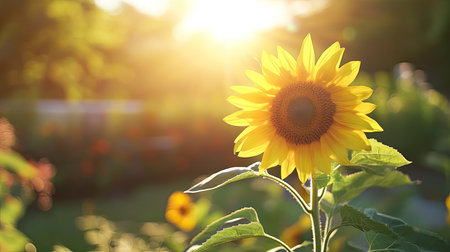 Vibrant sunflower with bright yellow petals and a dark center, facing the warm light of a setting sun in a green field. represents nature, summer, and growth.