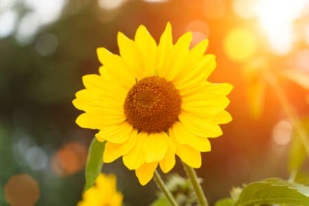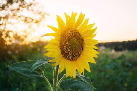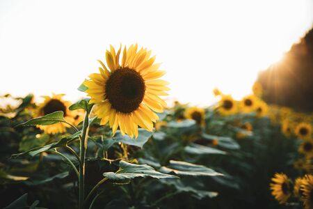Bright yellow sunflower on big agricultural field with sunset light background, summer nature flower