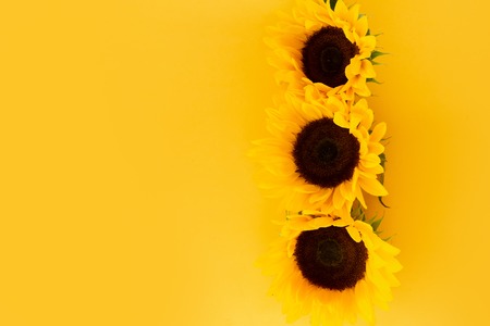 Sunflower fresh flowers heads on yellow, flat lay floral border with copy space
