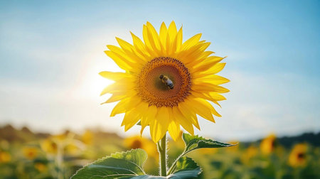 A cheerful sunflower with a bee resting on its center, capturing the interaction between nature and wildlife with the bright yellow petals in sharp focus.