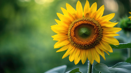 A stunning sunflower showcasing its vibrant yellow petals against a soft green background, symbolizing warmth and positivity in nature's beauty.