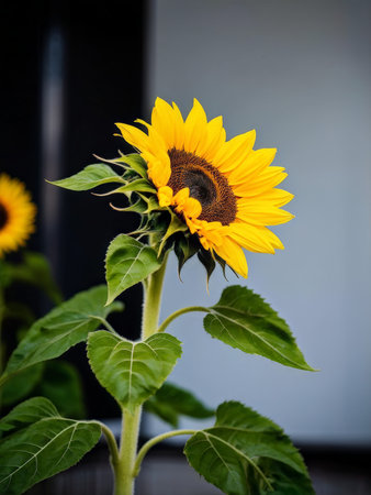 Bright yellow sunflower with green leaves on light background