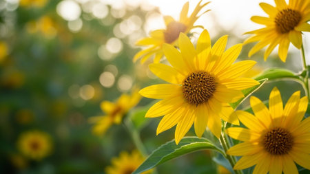 Bokeh showing close-up of bright yellow sunflowers in full bloom with green leaves and stems, illuminated by soft...