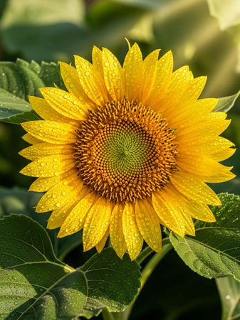 Sunflower with water drops on the petals. Sunflower natural background.