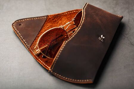 Genuine brown leather glasses case, handmade on a dark background. Glasses inside the case. Close-up