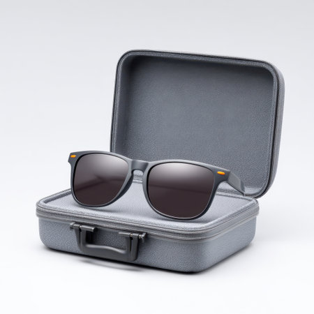 A pair of stylish black sunglasses rests in an elegant gray case, perfect for summer fashion and outdoor adventures. Ideal for casual or sophisticated looks.