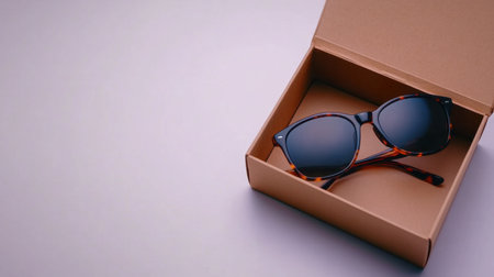 A pair of stylish sunglasses rests inside a brown box against a light background, ideal for showcasing modern fashion accessories and seasonal trends.