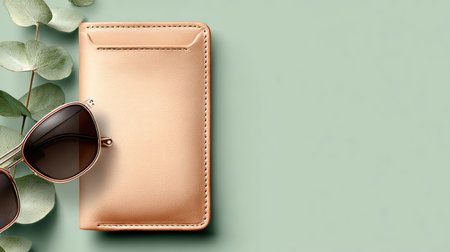 Leather case, sunglasses, and eucalyptus leaves arranged on a pastel green background.