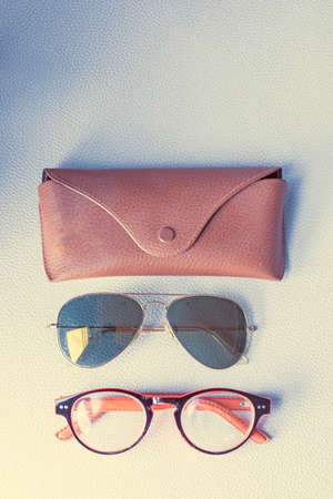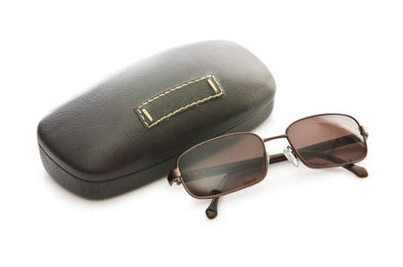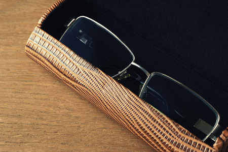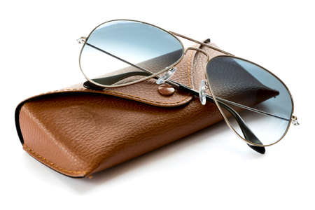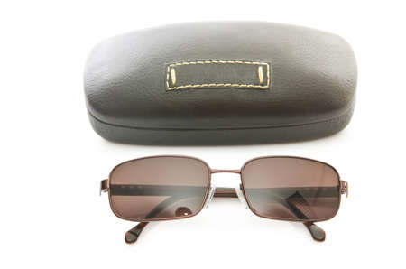 Sunglasses in case isolated. Brown case with dark lenses