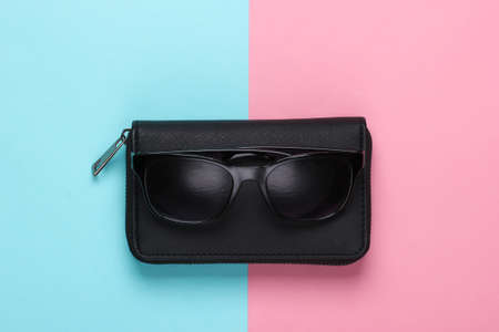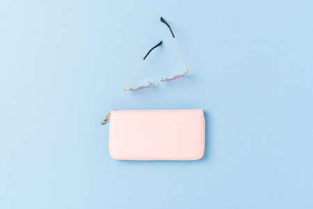 Wallet with sunglasses on a blue-pink pastel background. Women's accessories. Top view